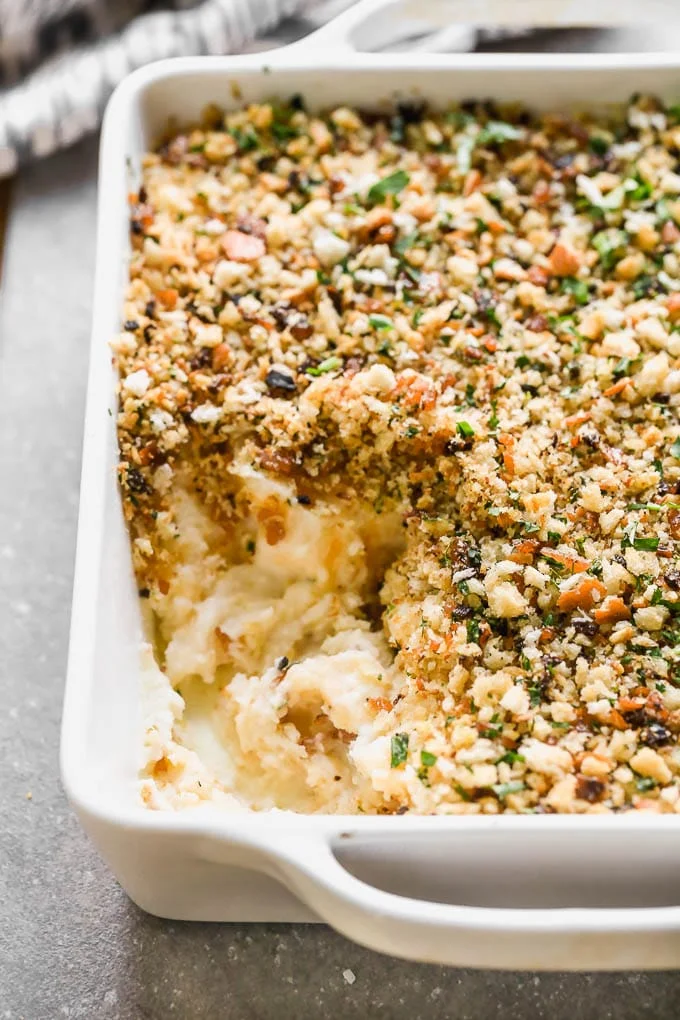 These cheesy potatoes taste JUST like a loaded baked potato, but in mashed potato form. They’re topped with a DELICIOUS garlicky bacon breadcrumb and baked. So good!
