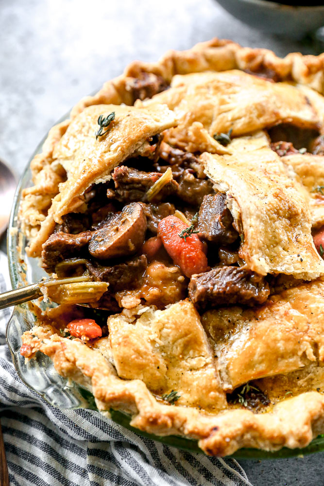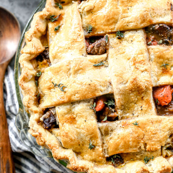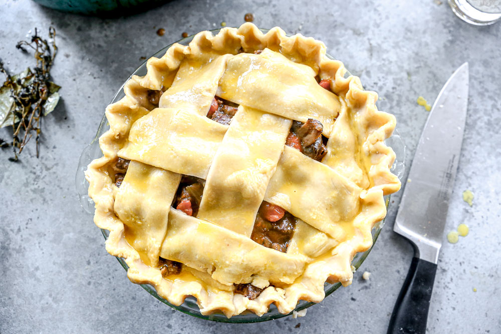 • If making a pie crust, while the beef cooks, make the pie crust and prepare the thickener: Whisk in ⅓ cup flour with 1/2 cup beef broth until smooth. Divide dough into two portions—one for the bottom crust and one for the lattice top. Chill until ready to use. When the beef is tender, slowly stir the flour and broth mixture into the simmering filling. Bring to a boil and reduce to a simmer. Stir frequently to avoid sticking until the beef mixture is thickened and glossy. The filling should be rich and stew-like, not watery. Add remaining tablespoon butter. Stir until melted. Let cool slightly before assembling.