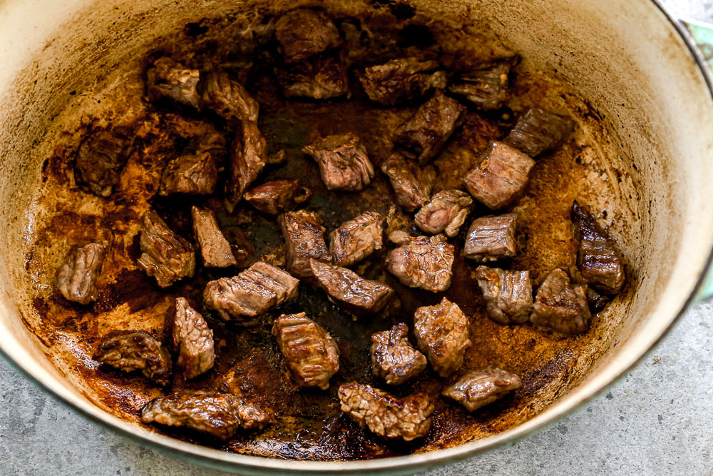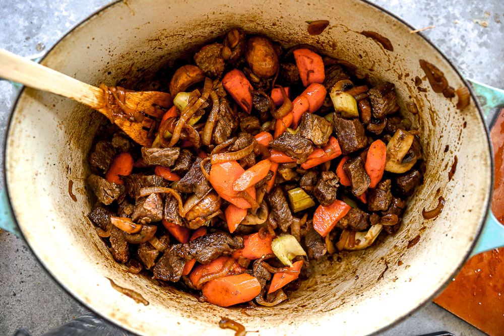 Brandy. Typically in a beef stew you use red wine but I love adding brandy to my french onion recipes so I wanted to mimic that unique flavor.