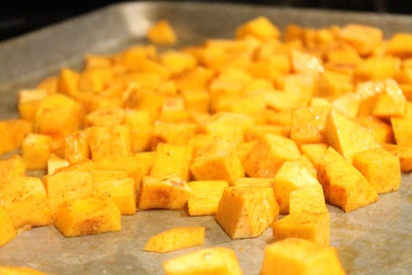 Toss cubed squash with a little cinnamon, cardamom, nutmeg, salt, and olive oil.