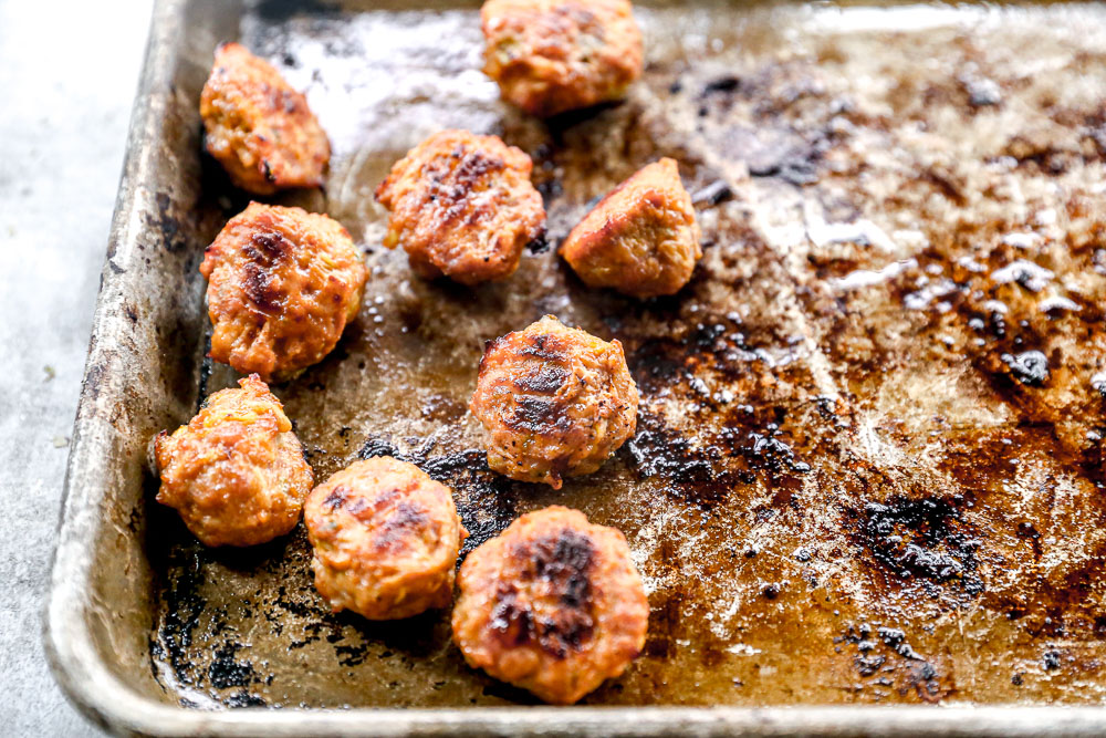 - Use a small cookie scoop to form the mixture into 1 1/2-inch meatballs. Place on the prepared baking sheet. I like to spray the scoop with non-stick spray and then scoop the meatball mixture out of the bowl. Release the ball on to the sheet pan. Repeat with remaining meatballs. Rub a little non-stick spray or cold water on your finger tips and palms. Roll the cookie scoops into uniform, smooth balls.