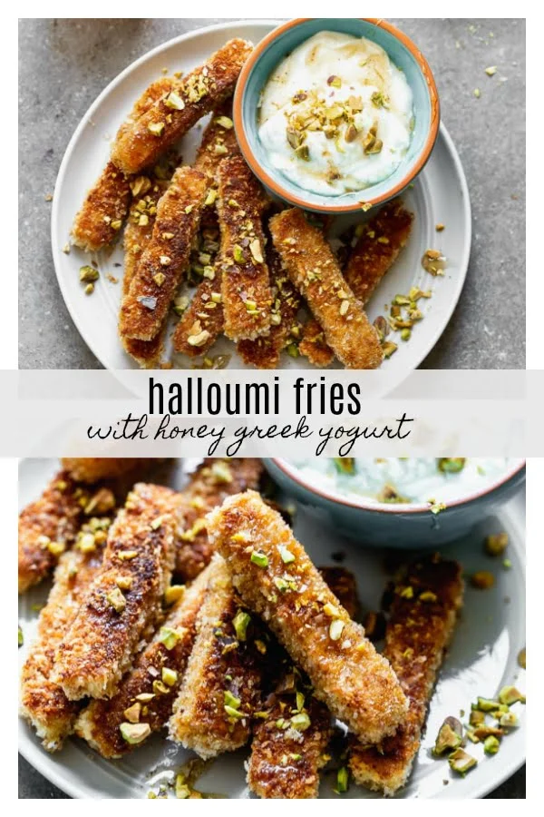 These salty, crispy Mediterranean fries are sort of the equivalent to a fried mozzarella stick, but so much better. Instead of mozzarella, we bread and pan-fry halloumi cheese and drizzle the crunchy, salty concoction with a little bit of honey and chopped pistachios. We serve it with a super easy honey Greek yogurt for a dipping sauce, and let our guests go to town.