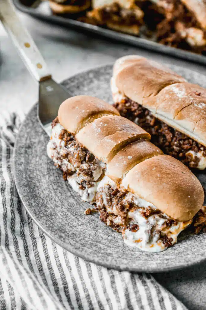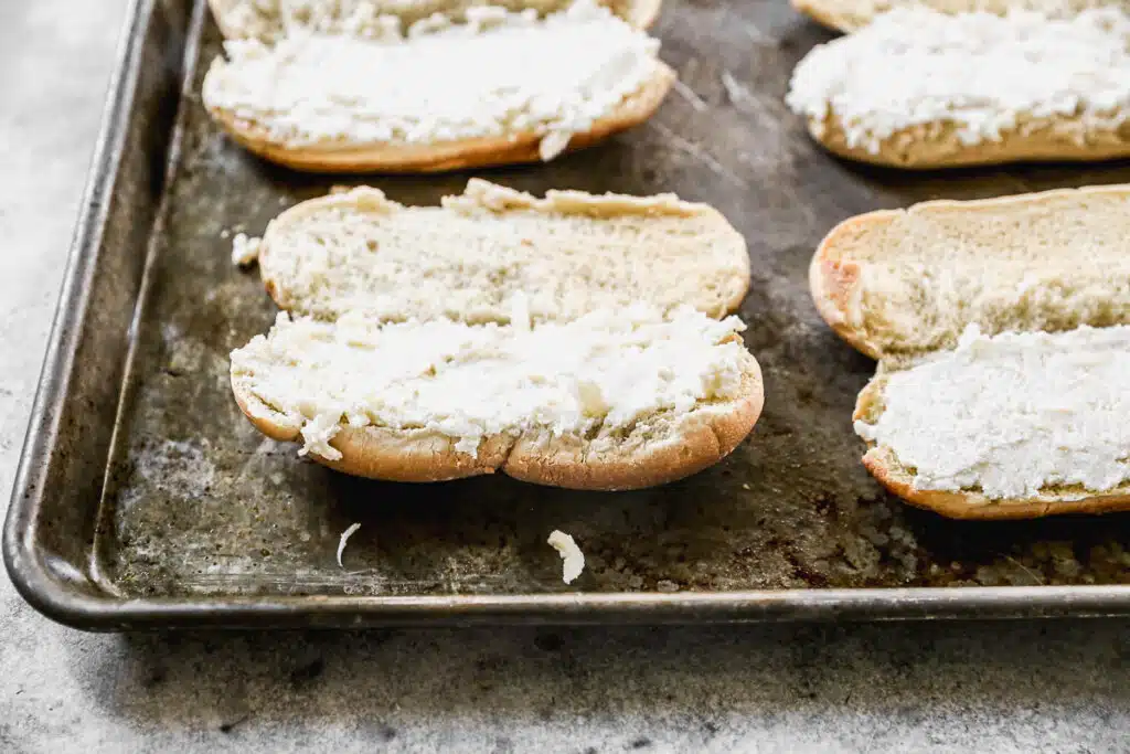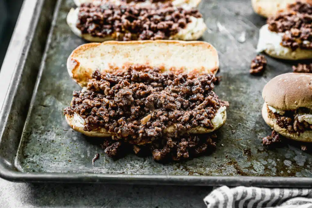 - Line the hoagies cut side up on the prepared baking sheet. Pop in the oven for 5 minutes to toast. Spread 1/6 of the spread on each cut side of the hoagie. Spoon the meat filling on one side of the hoagie. Pop the pan back in the oven and baked until the cheese spread is hot and gooey.