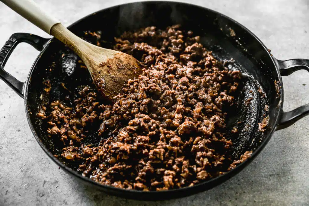 - Heat a large skillet with high sides to a medium heat. Drizzle with olive oil. When the oil is hot, add the ground beef, Italian sausage, onion and garlic. Use a wooden spoon to break up the meat. Let the meat cook without disturbing for 3-4 minutes so it starts to brown on the bottom. Use the wooden spoon to continue to break up the meat. Add the teaspoon of salt and tomato paste. Cook for 1 minute. Add the red wine. Bring to a boil and reduce to a simmer. Simmer until reduced by half. Add the tomato sauce, water, Italian seasoning, garlic powder and onion powder. Bring to a boil and reduce to a simmer. Simmer for 10 minutes.