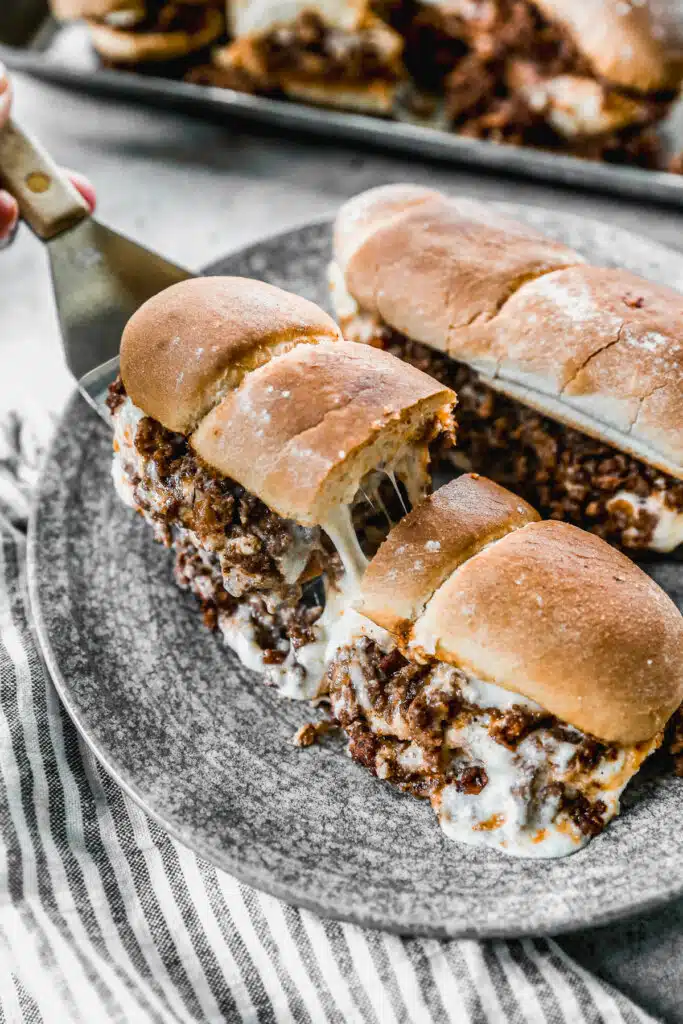 This sloppy joe-esque style sandwich has all the nuances of a classic piece of lasagna – the rich meat sauce, the creamy ricotta cheese, the cheese pull of stringy mozzarella – but in a much more manageable form.