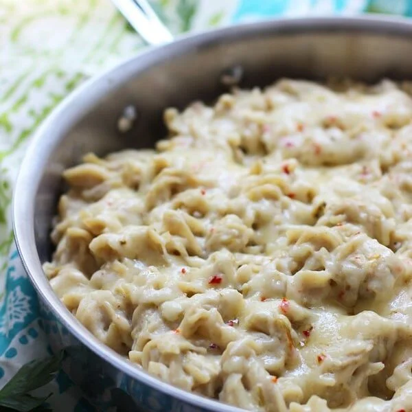 I was craving my sour cream enchiladas (pardon the old pictures), but had zero motivation to cook the chicken, make the sauce, roll the enchiladas and then bake them; a process that would take at least an hour. Instead, I took all the flavors and swapped out the tortillas for the pasta, cooked it all in one pot, and called it a day.