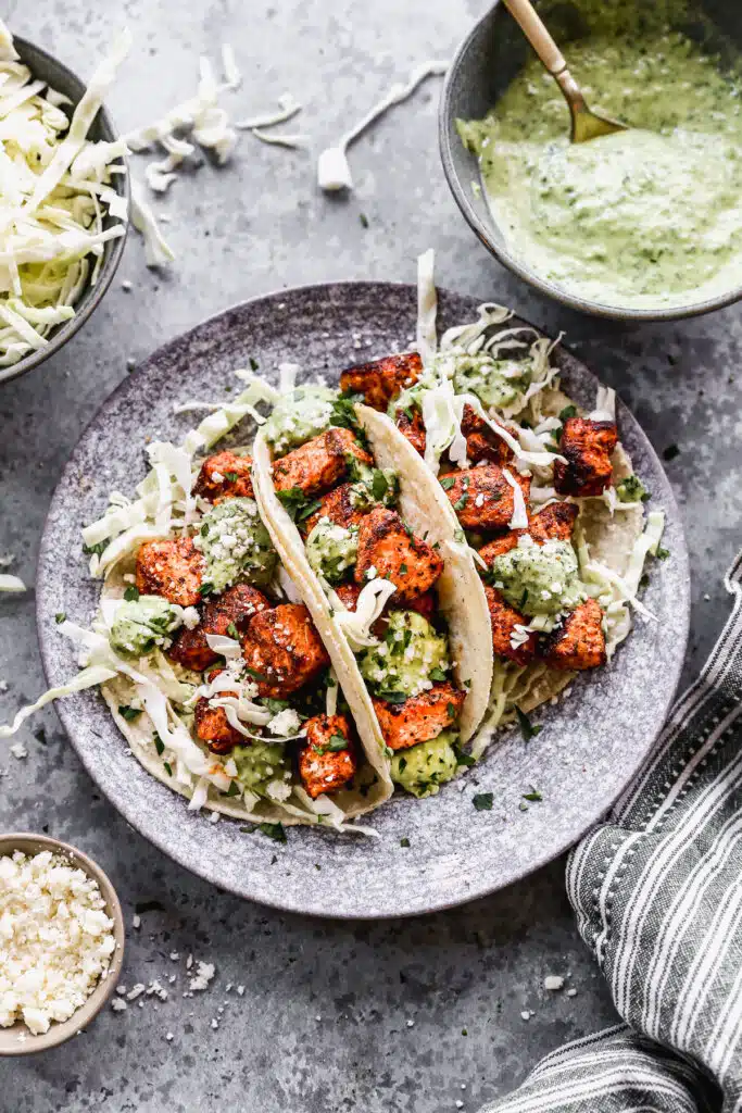 Stuffed with buttery blackened salmon bites and shredded cabbage then drizzled with a luscious Jalapeño cilantro Crema and crumbled Cotija cheese, our Salmon Tacos are sure to hit the seafood spot.