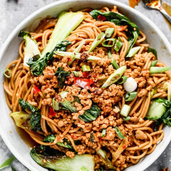 Our version of Spicy Dan Dan Noodles retain all the tangy sesame-chili flavor, saucy ground meat topping, and chewy noodles we adore in the classic version but we use more pantry staples and give it a boost in the health department. By swapping out ground pork for ground chicken and whole-wheat noodles instead of white-flour Chinese noodles, we make this a dish you don’t have to feel guilty enjoying.