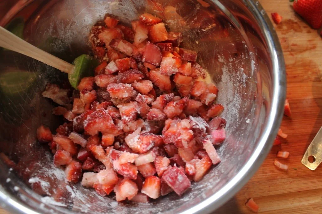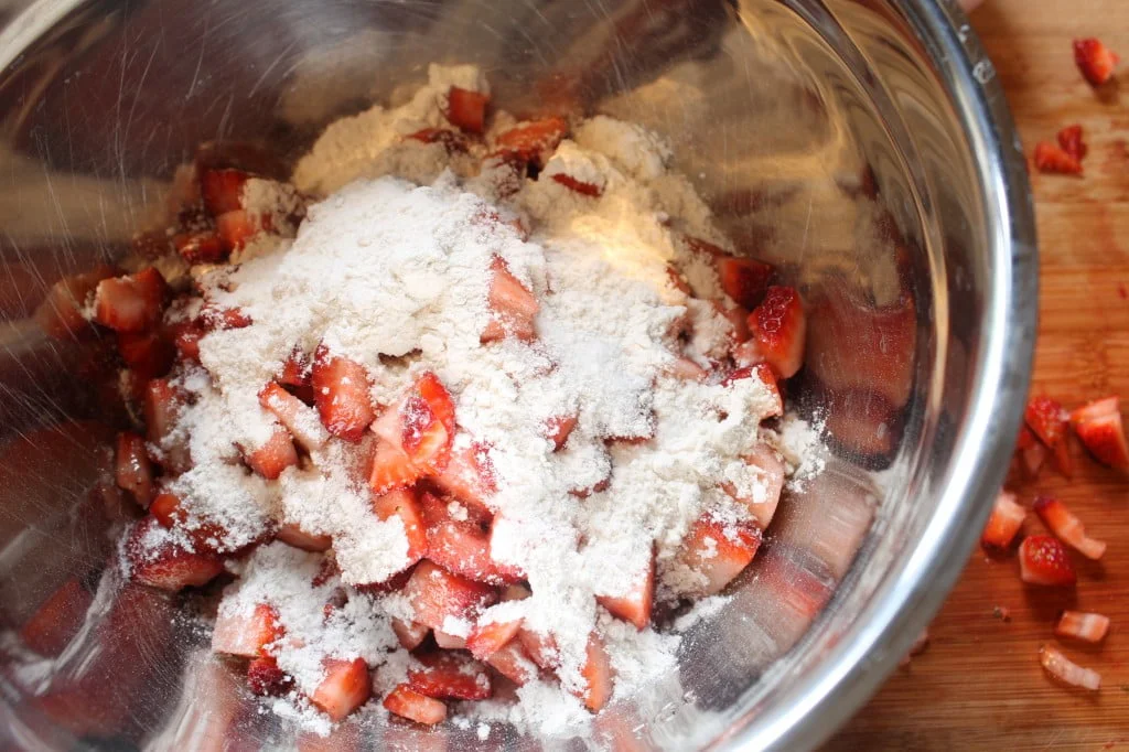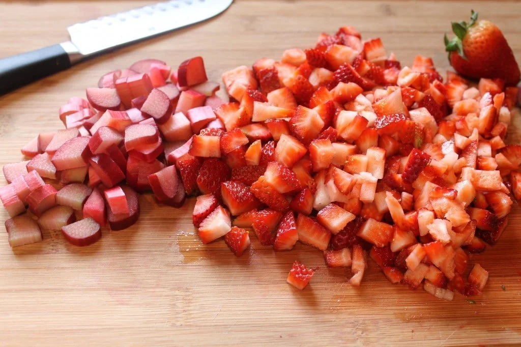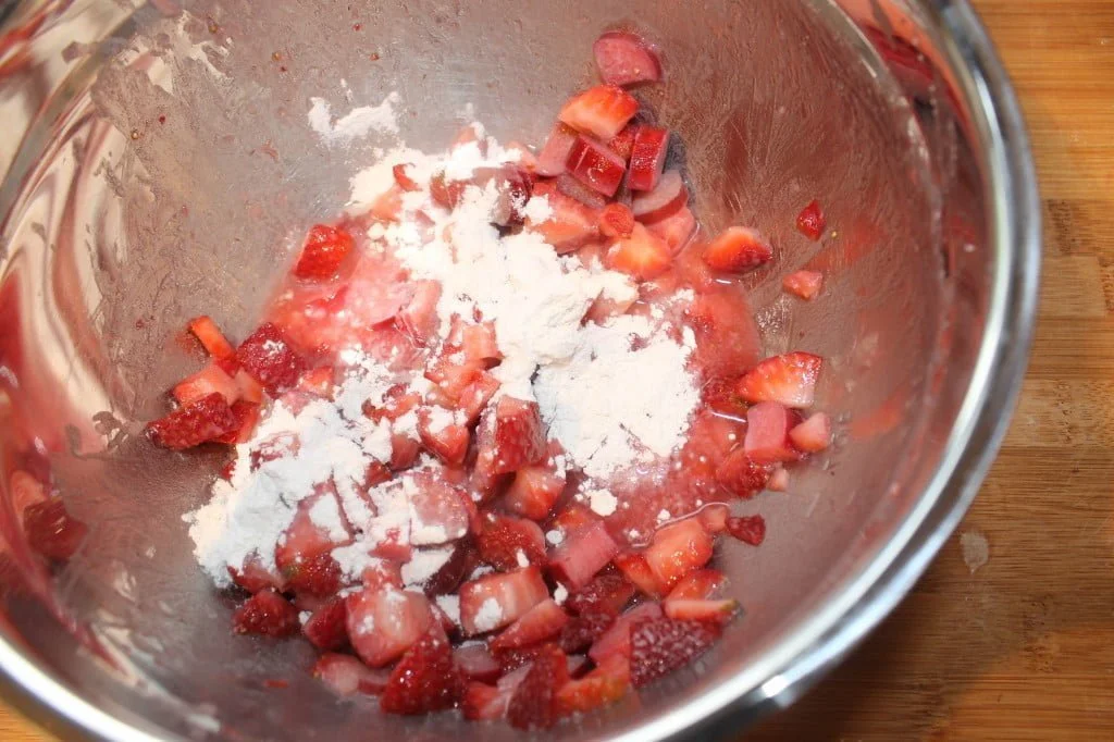 Time to start the filling. Chop strawberries and rhubarb into small pieces. If we were making a whole pie I would keep them bigger but we’re sticking with the miniature theme.