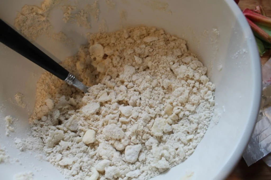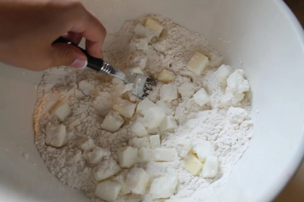 Using a fork cut the shortening and butter into the flour mixture.