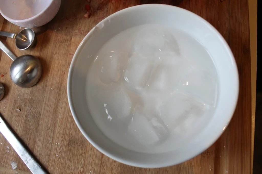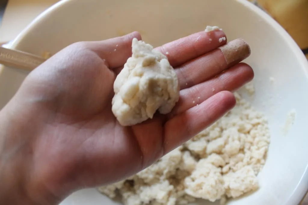 Fill a bowl with ice water. Add three tablespoons of the ice water to the mixture. If it doesn’t come together, add more water one tablespoon at a time until the dough can be formed into a ball. The mixture will still be a little crumbly.