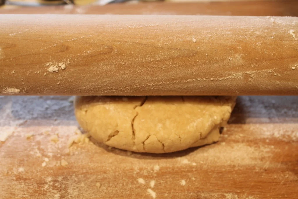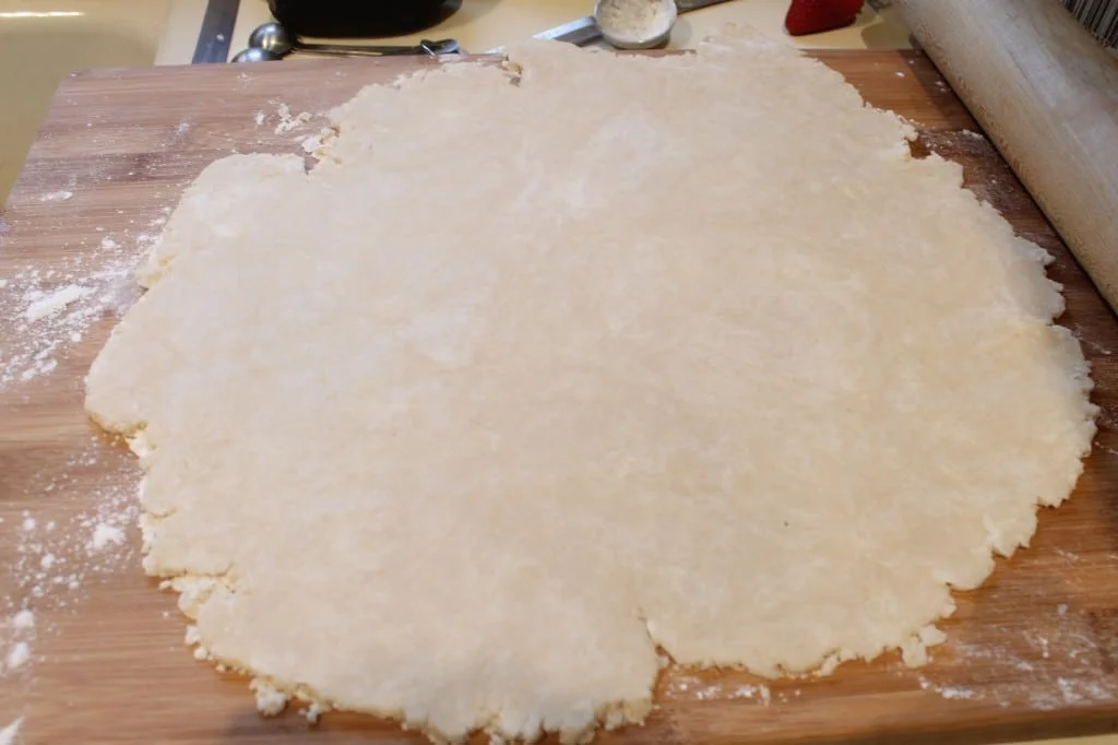 Flour a flat surface; I like to use my big wooden cutting board. Start to roll dough out moving quickly.