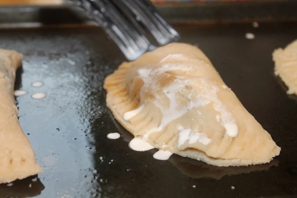 After their little cat nap in the refrigerator, place them on a greased cookie sheet.  Brush with cream and sprinkly with sugar.  It’s not shown here but cut three slits in the top of each pie to let the steam escape while baking.