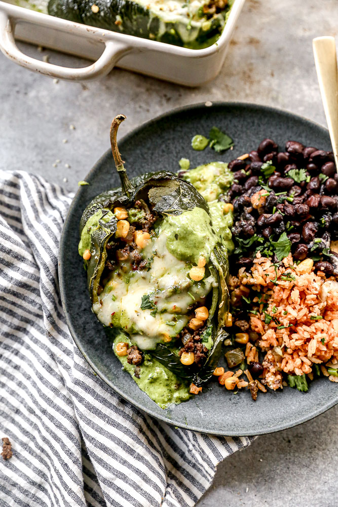 We roast mild poblano peppers until smoky and tender, hollow them out and then fill them with a cumin-scented ground beef, sweet corn, and black bean mixture. In a chile relleno mimicked move, we blanket the stuffed peppers in a seriously addictive poblano cream sauce (see our poblano chicken and poblano pasta comments here to believe the hype) and finish them off with melty jalapeño cheddar cheese.