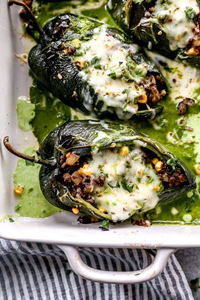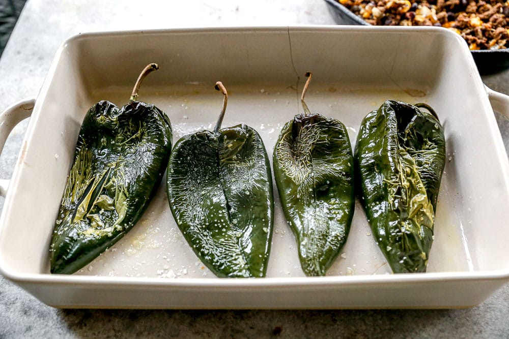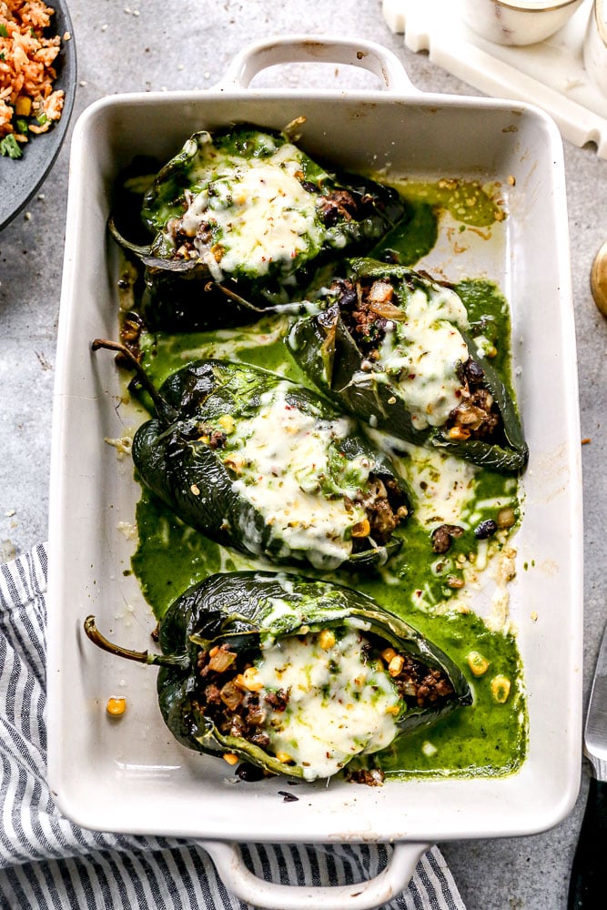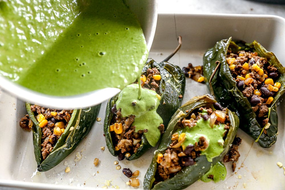 - Spoon beef mixture evenly into each roasted poblano. Place the baking dish with the stuffed peppers in the oven and bake for 10-15 minutes while you make the sauce.