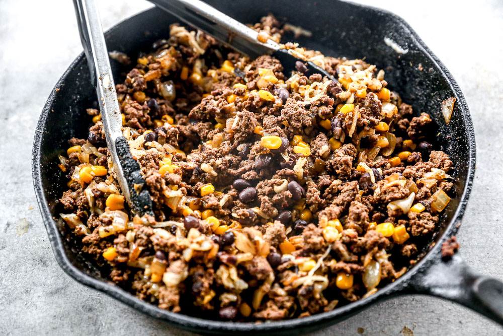 Make the filling. Heat a large skillet over medium heat. Add the ground sirloin and cook until browned, breaking it up as it cooks.Add the onion and cook 2–3 minutes, until slightly softened. Stir in garlic, cumin, oregano, garlic powder, and salt. Add water, black and corn. Simmer for a few minutes.