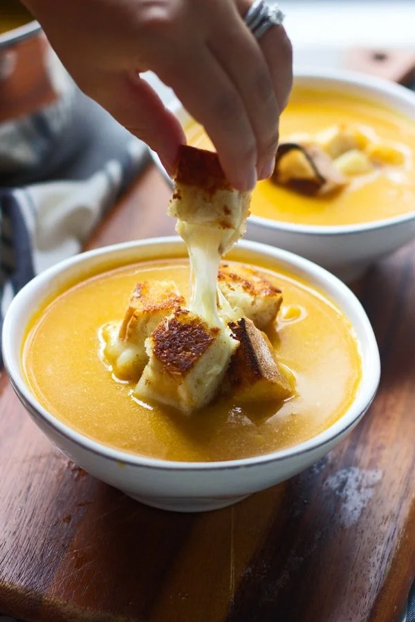 Butternut Squash, Apple Cider and Cheddar Soup with Roasted Garlic Cheddar Grilled Cheese Croutons