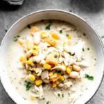 Add white beans, green chiles, reserved pancetta, seared chicken (with accumulated juices), remaining salt, chicken stock, and corn. Bring to a boil and reduce to a simmer. Simmer for 20-25 minutes until beans start to soften, sweet potatoes are fork-tender and chicken is cooked through. I like to simmer for another 20-25 minutes if time allows. Season with salt and pepper. Use two forks to find the chicken tenders and shred as much or as little as you want. I like it to be mostly shredded so the soup gets nice and thick.